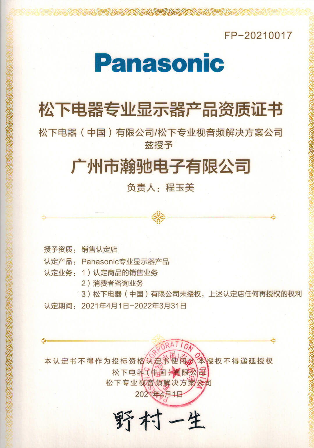 松下電器專業(yè)顯示器產(chǎn)品資質(zhì)證書