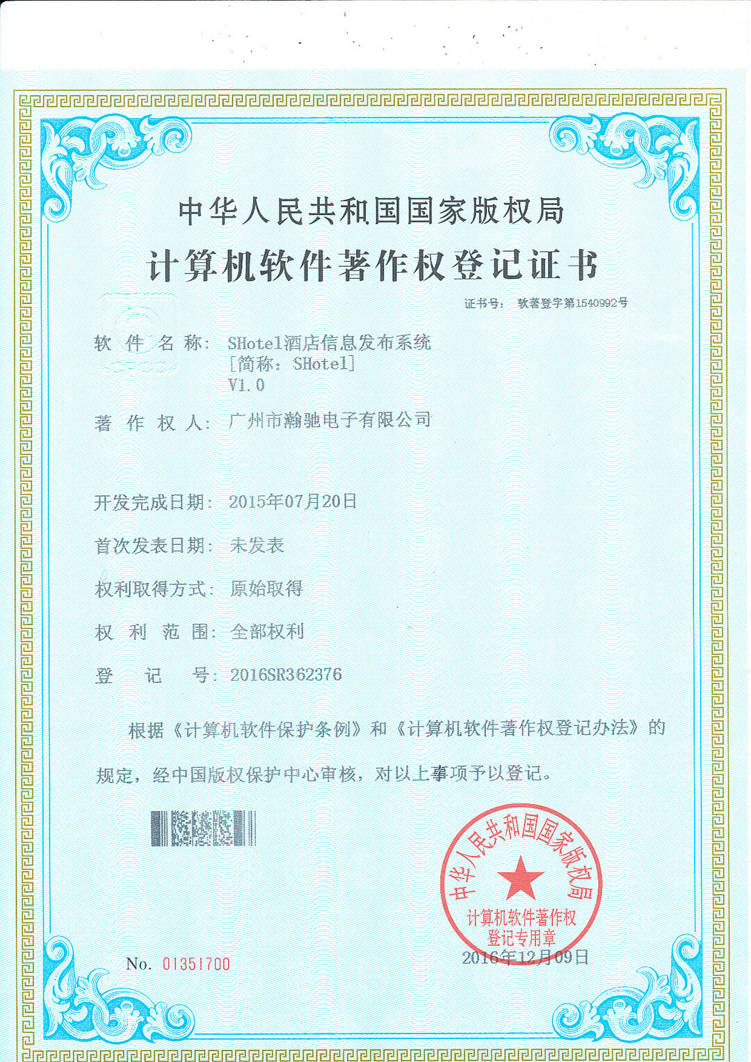 軟件著作權(quán)證書原件